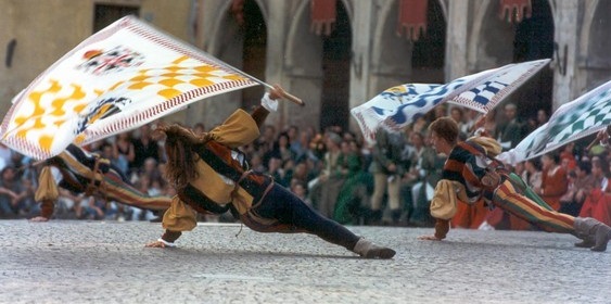 Risalgono agli anni ‘70 i primi esperimenti dei giovani isolani con le bandiere, quando nelle contrade i ragazzi cercavano sempre nuovi modi per abbellire il Palio, la rievocazione nata quasi per gioco solo pochi anni prima.